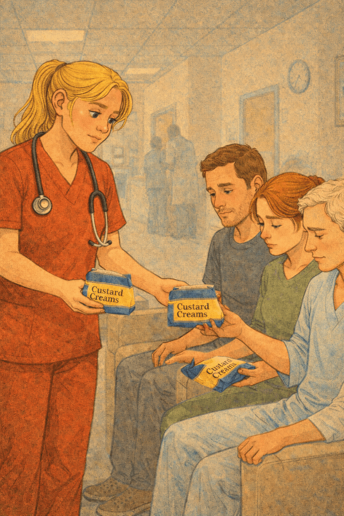 We reached a natural break in the conversation, and The British in me took over. Tea. That’s what this situation needed: tea. Good old tea, and good old biscuits. I acknowledged that I’d dropped a bombshell; asked if you’d all like a cup of tea, water, coffee. Any biscuits? You all look up in unison and the same two words pour out: custard creams.